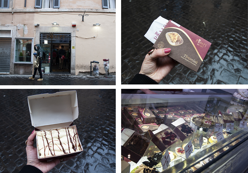 Το καλύτερο τιραμισού της Ρώμης. Pompi Il Regno del Tiramisu με το όνομα. Με έξι μαγαζιά, το ένα πολύ κοντά στην Piazza di Spagna, δεν έχεις δικαιολογία για να μην δοκιμάσεις. Θα βρεις το κλασικό τιραμισού και επιπλέον πέντε διαφορετικές γεύσεις. Προσωπικό αγαπημένο, τιραμισού μπανάνα-σοκολάτα. Ιδανικά μπορείς να το απολαύσεις στην piazza di Spagna κάποιο απόγευμα.